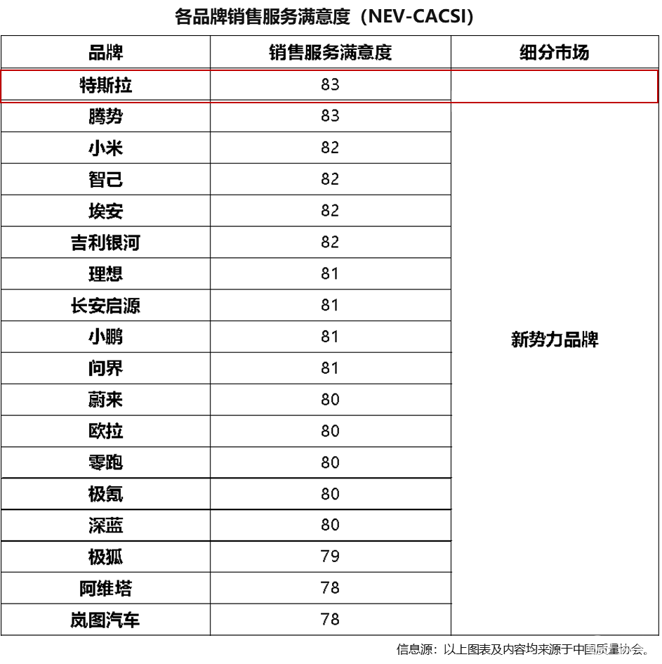 在品牌方面,特斯拉同时拿下销售服务和售后服务两项满意度第一名。