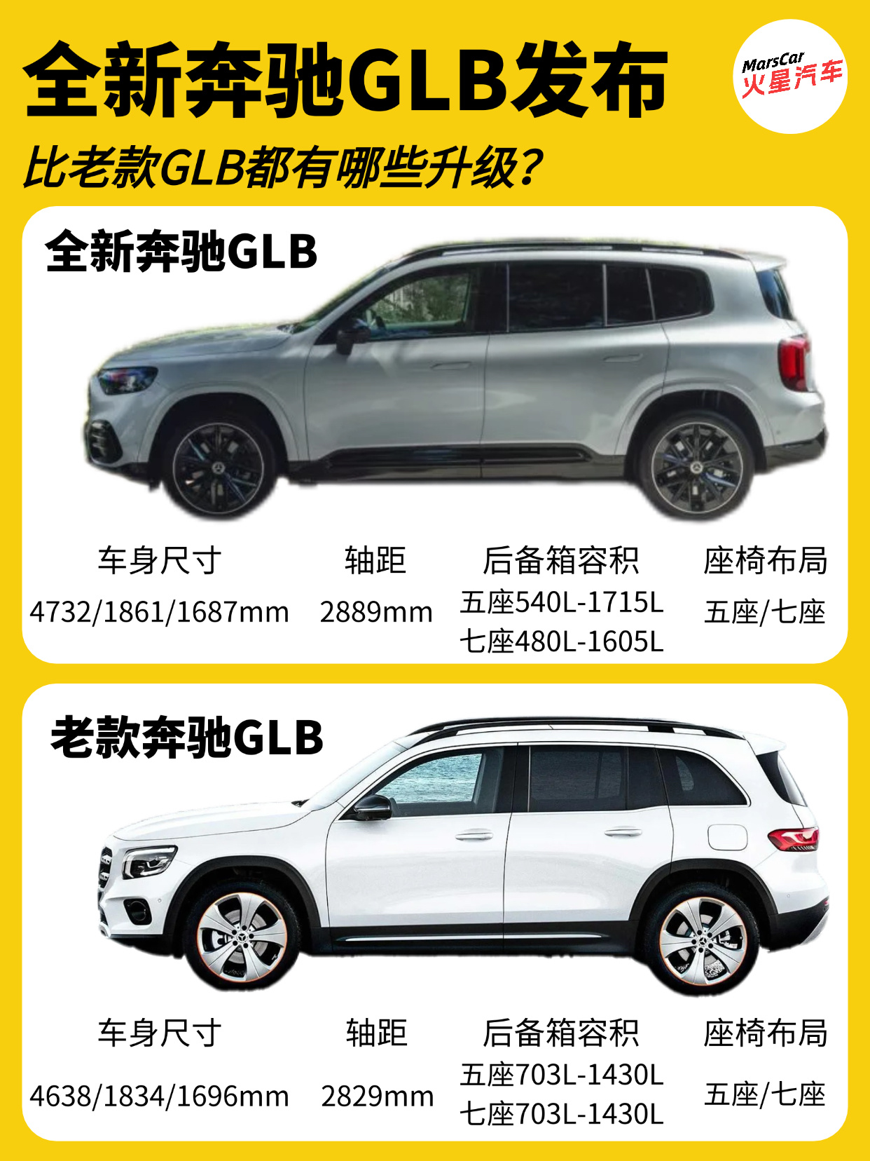 车身侧面,全新GLB腰线更加平直,而平直的车顶线条和近乎垂直的尾窗,能为第三排带来充足的头部空间。新车提供5座和7座布局,长宽高为4732/1861/1687mm,相比老款,长和宽增加94mm和27mm,高度降低9mm,轴距多了60mm,达到2889mm,前排最大头部空间增加35mm,第二排和第三排的乘坐空间分别增加64mm和10mm,五座版后备箱容积为540L,最大可拓展至1715L。七座版容积为480L,最大可拓展至1605L。