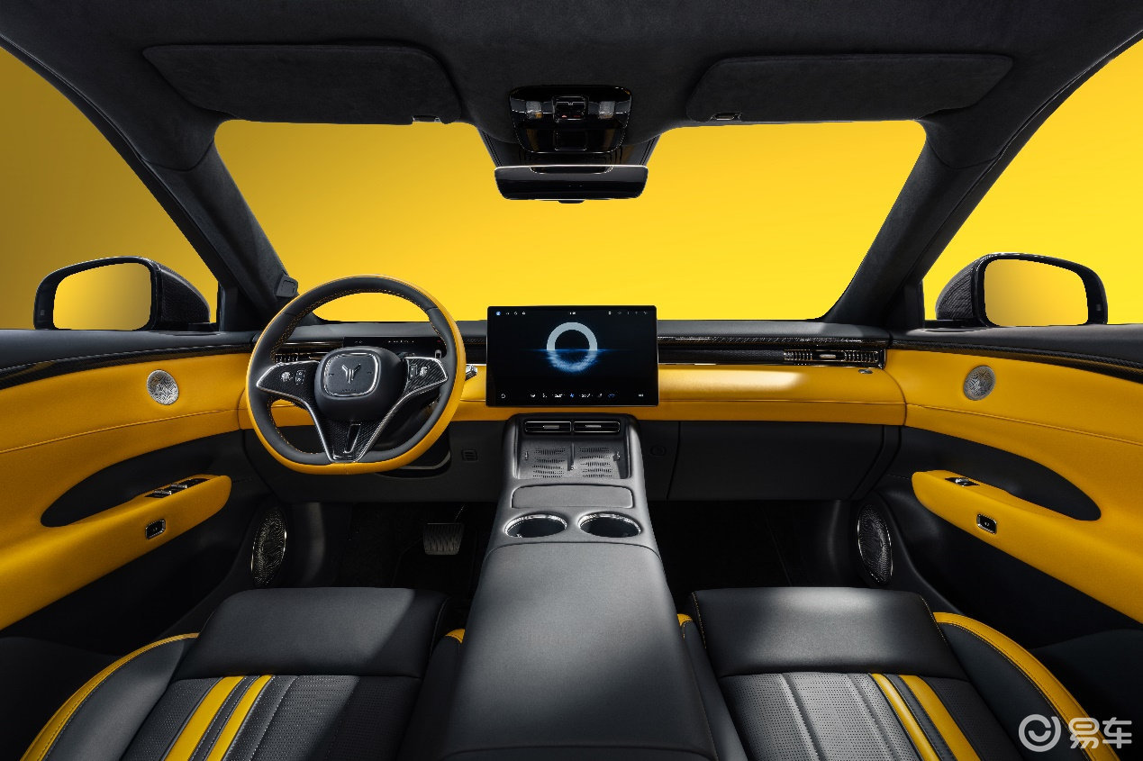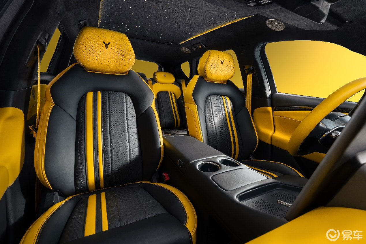 新车内饰延续外观撞色设计,采用玄金双拼撞色内饰,跳脱的对比色瞬间点燃座舱气氛,激发驾驶欲望。仪表台、门护板、方向盘、座椅等关键区域均有黄色超纤包覆,与A/B/C柱及顶棚的仿麂皮材质,共同营造出激情、豪华的内饰氛围。升级定制的NAPPA环抱式运动座椅,精选头层牛皮带来温润细腻的触感,严密的人体工学设计确保在激烈驾驶时提供全方位的支撑与包裹;暗影哑光碳纤维组件覆盖外后视镜、驾驶舱前内饰面板、方向盘等部分,100%真碳纤维丝带来的独特纹理与质感,点亮了座舱的运动豪华气息。