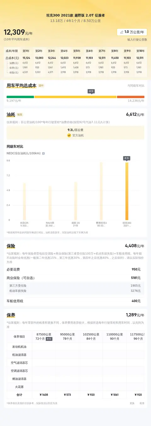 据估算,同级车的最低用车成本是5198元/年,最高是13731元/年,坦克300 2021款 越野版 2.0T 征服者是12461元/年,用车成本较高。