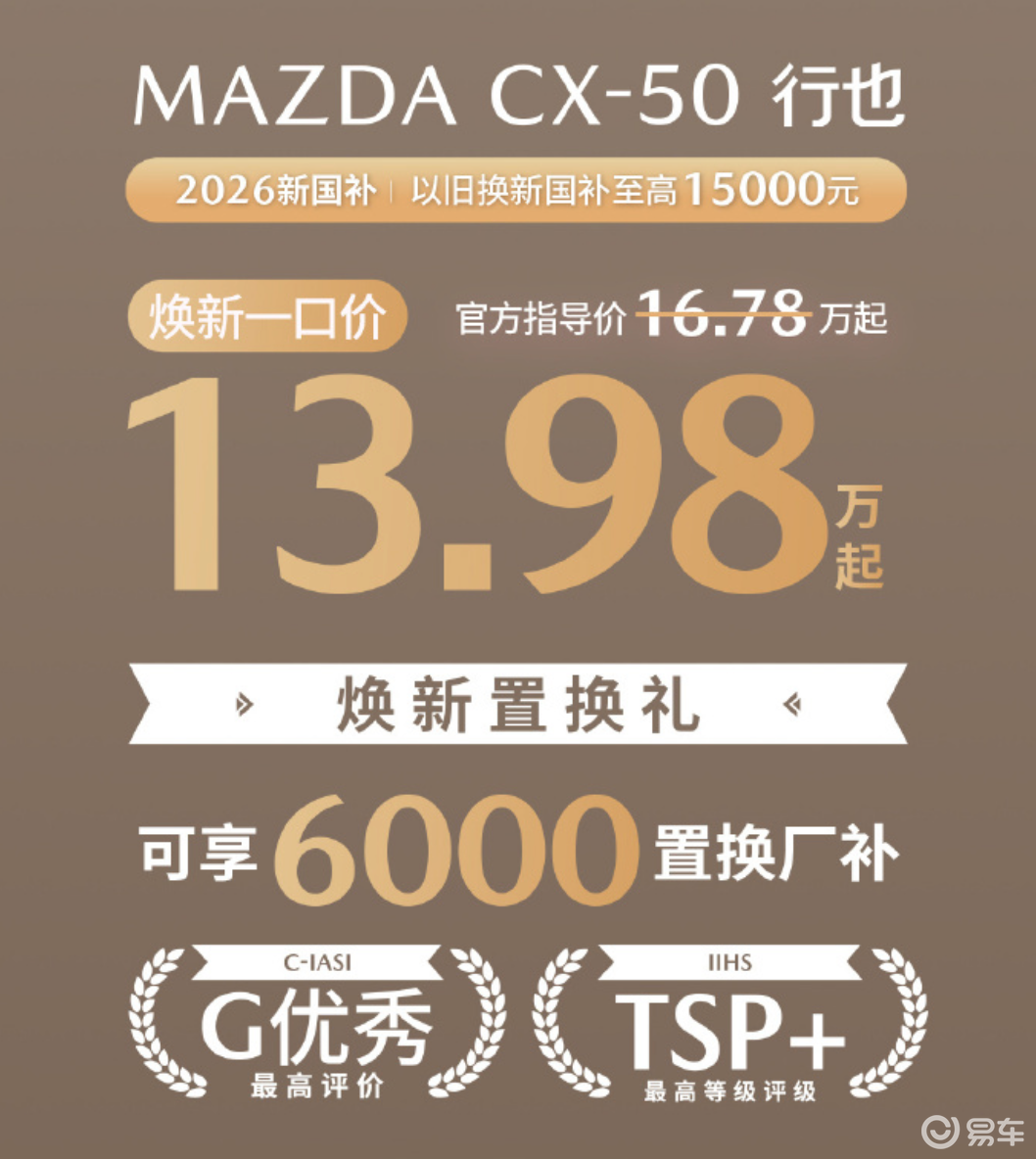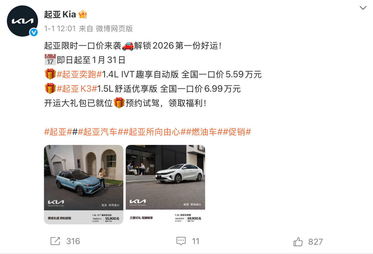 不过,现在玩“一口价”策略可不单只有凯迪拉克。就在1月1日,长安马自达CX-50行也推出“焕新一口价”——13.98万元起,直降 3.2 万元;悦达起亚则推出“全国一口价”:2026款起亚奕跑1.4L IVT趣享自动版5.59万元,起亚K3 1.5L舒适优享版6.99万元。