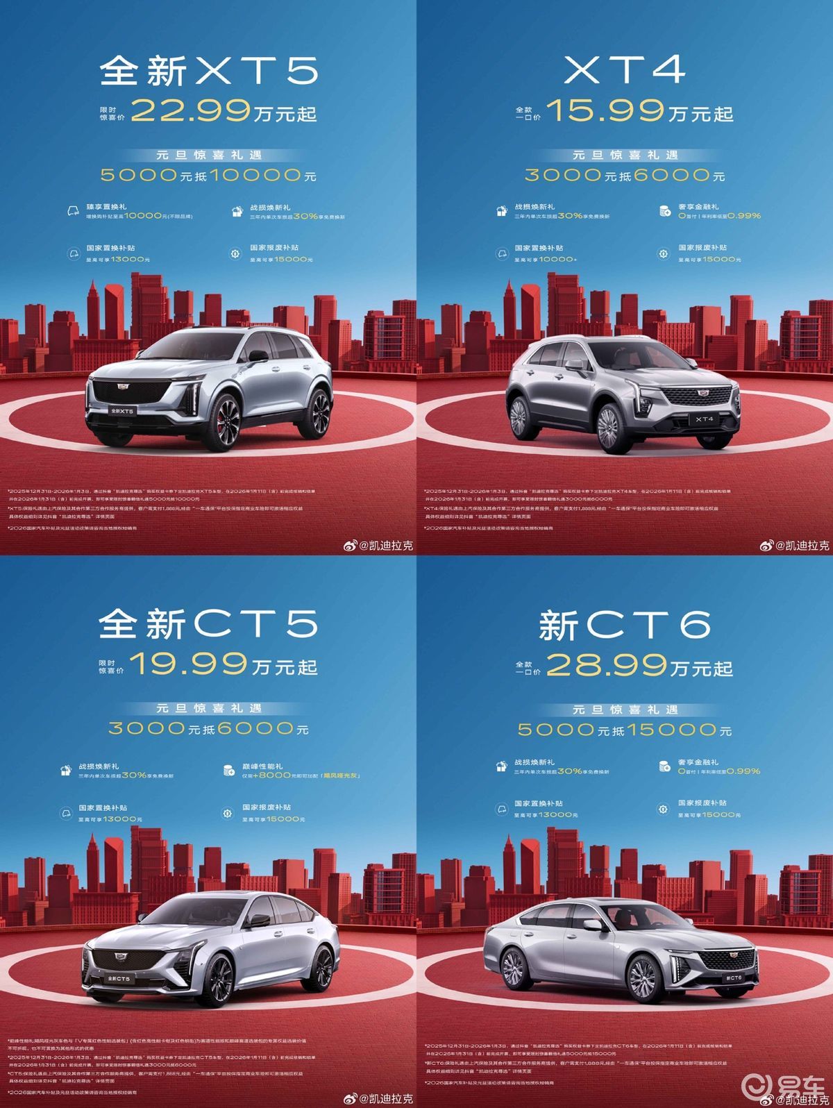 除了宝马,另一边凯迪拉克的降幅也毫不示弱,多款车型再续“一口价”优惠。其中,全新CT5直降9万元,限时起步价19.99万元;新CT6直降8万元,限时起步价28.99万;全新XT5直降5万元,限时起步价22.99万元;XT4直降6.98万元,限时起步价15.99万元。