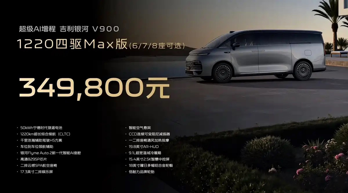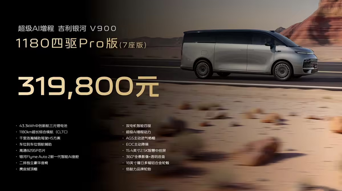 1月7日,吉利银河V900正式开启预售,其预售价区间为31.98万—38.98万元。值得一提的是,这也是银河汽车旗下首款中大型MPV产品。