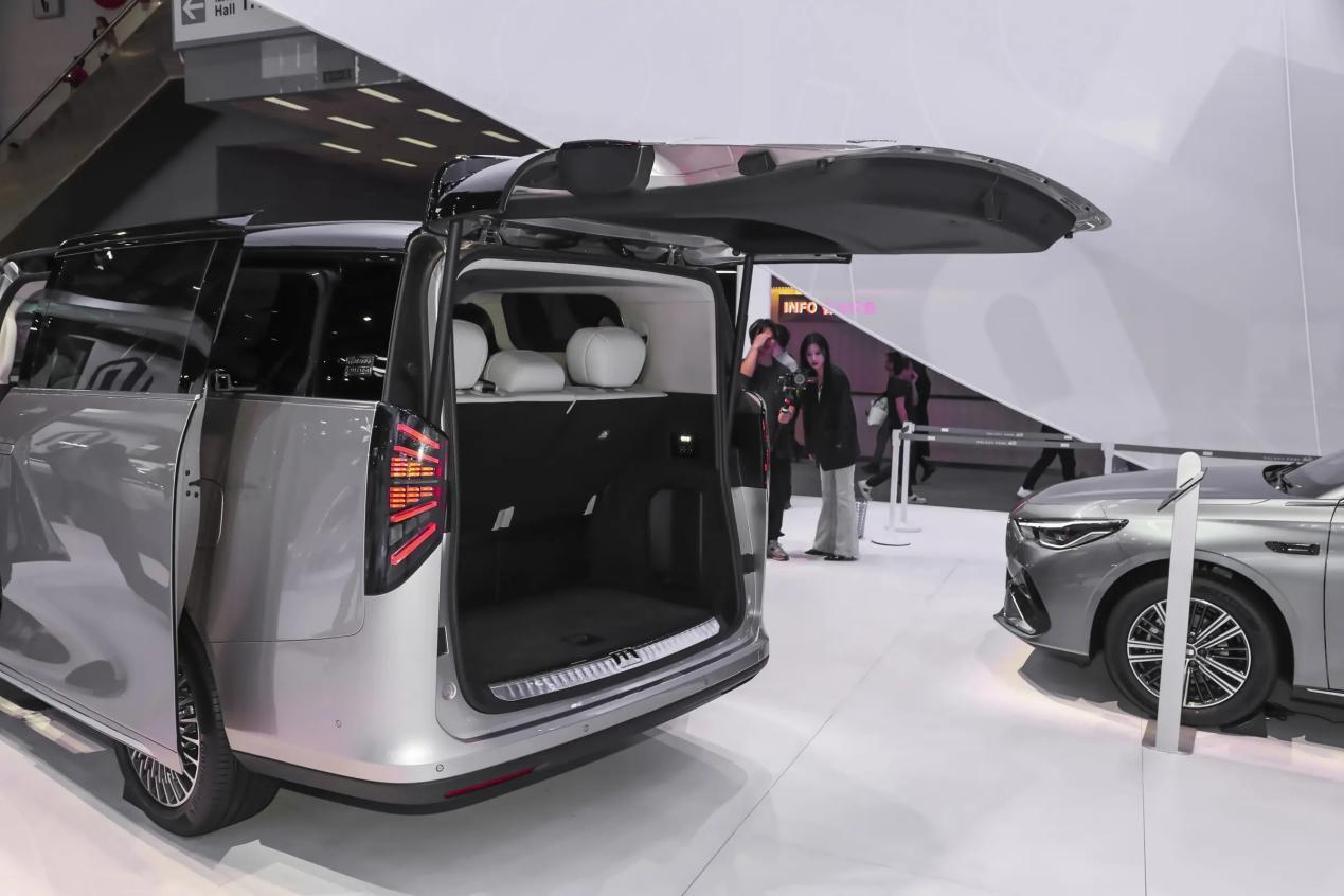 这车在外观方面也延续了家族式的设计语言,上方配备了贯穿式的LED日间行车灯灯带,因为用了增程动力,所以这次车头加了个大尺寸前格栅。分体式大灯就藏在格栅两边,整体辨识度挺高的。跟那些走传统MPV路线的竞品比起来,风格明显不一样。