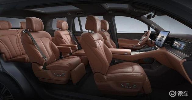 内饰部分,腾势N9营造出浓厚的豪华氛围。车内采用“2+2+2”六座布局,前排最大空间1052mm,第二排1063mm,第三排1040mm的腿部空间。车内还配备智能冷暖三开冰箱,容积为11L,可制冷至-6℃,制热至50℃。二三排均配备侧窗遮阳帘和双小桌板,实用性强。
