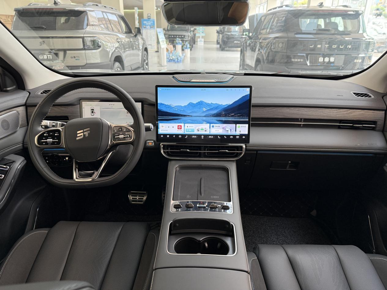 相比之下,捷途山海L9则走的是实用务实路线。其内饰采用规整的T字形布局,作为新近改款车型,用怀挡取代了传统挡把,并在无线充电的位置提供了一排物理按键。
