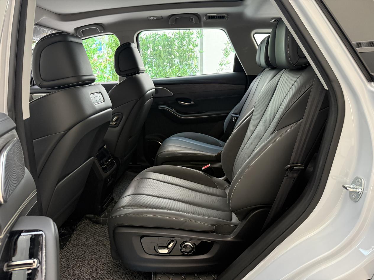 捷途山海L9的第二排腿部空间同样约为两拳。座椅延续品牌一贯偏硬的风格,包裹性一般,座椅宽度很好,更适合身材宽大的乘客,但对体型偏小的用户支撑稍显不足。皮质手感也偏硬。得益于较宽车身,其中央过道可容成年人直接进入第三排。