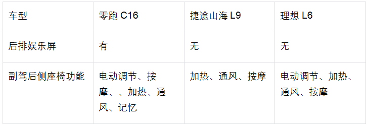 三车均配备二排加热、通风与按摩,符合同级da'konSUV主流配置水准。尽管理想L6在功能排布、质感营造及附加配置上更具优势,零跑C16在核心舒适与实用功能方面并未显著落后,反而在整体性价比上表现更为突出,特别适合追求配置全面性与乘坐舒适,同时注重预算的消费者。