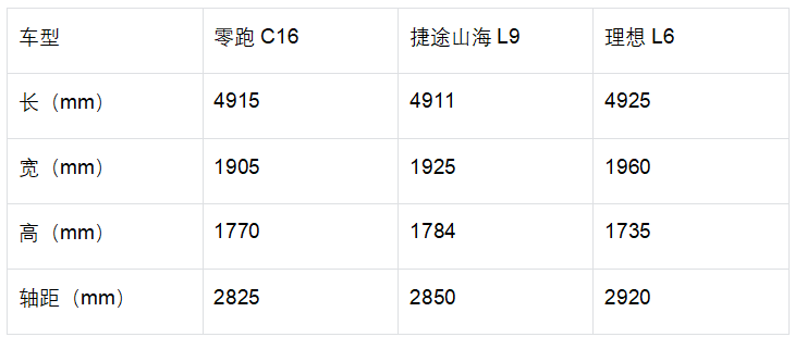 对于家用SUV而言,第一个硬指标一定是空间,这直接关系到家人舒适度和出行的装载能力。从三车身尺寸可以看出,零跑C16的车身尺寸介于山海L9和理想L6之间,那么三款车的车内实际空间对比如何?